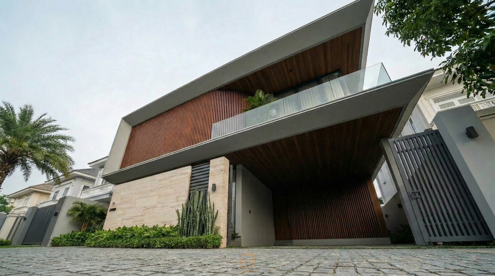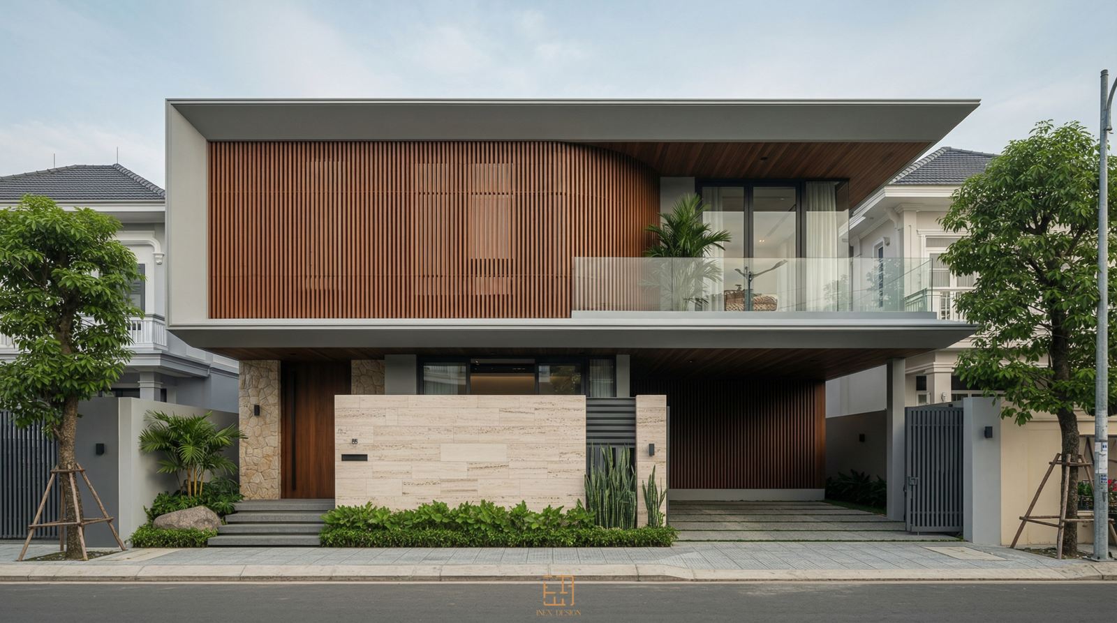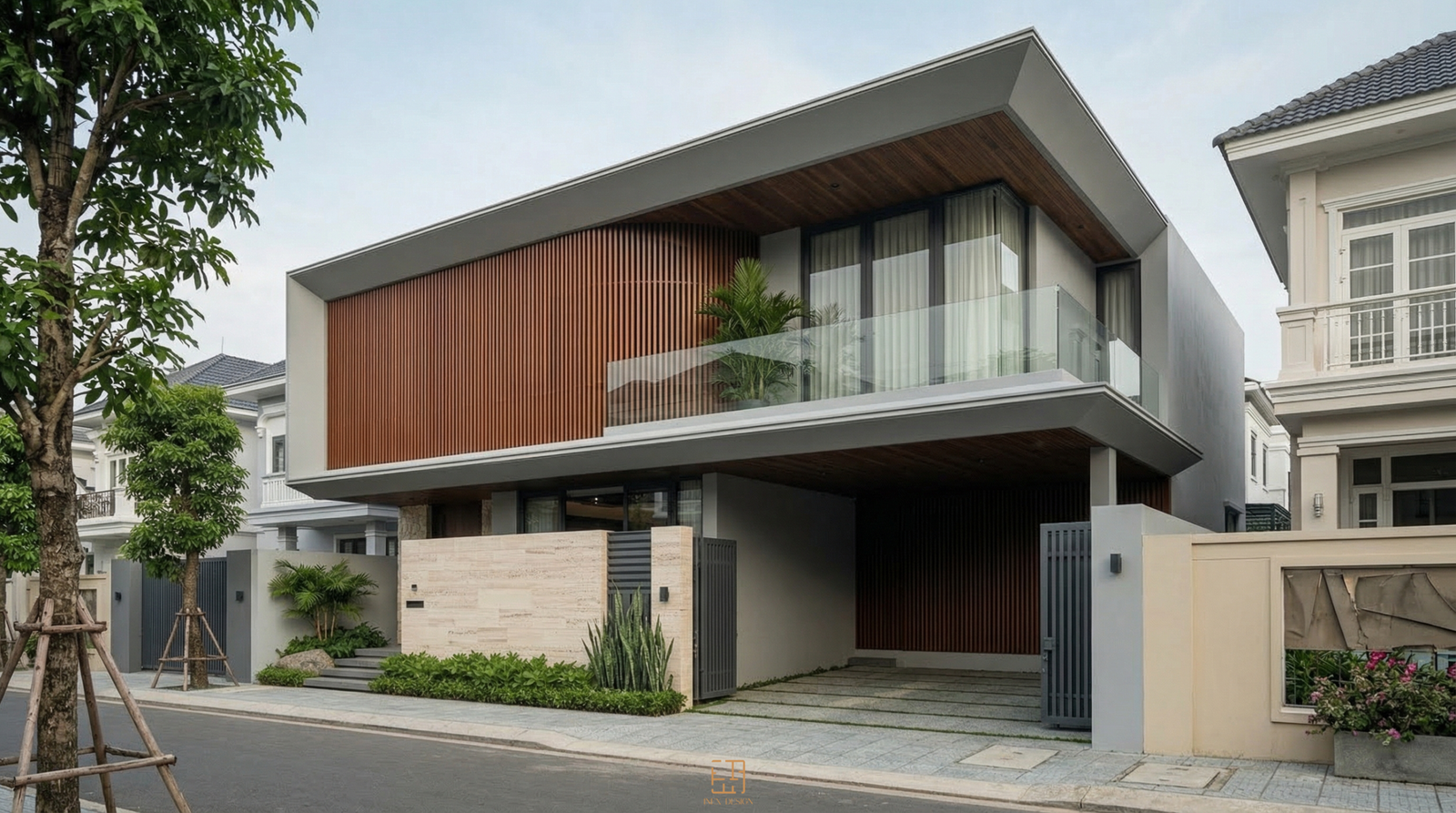 Tại BLOCK 8, ngôn ngữ thiết kế được định hình bởi những đường nét tối giản, dứt khoát. Điểm nhấn nằm ở hệ lam gỗ chạy dọc bao phủ diện mạo tầng hai, tạo nên một lớp màng lọc ánh sáng đầy tinh tế. Sự tương phản giữa bề mặt đá travertine thô mộc ở khối đế và hệ trần gỗ ấm áp phía trên tạo nên một nhịp điệu vật liệu ổn định, sang trọng nhưng không phô trương.
