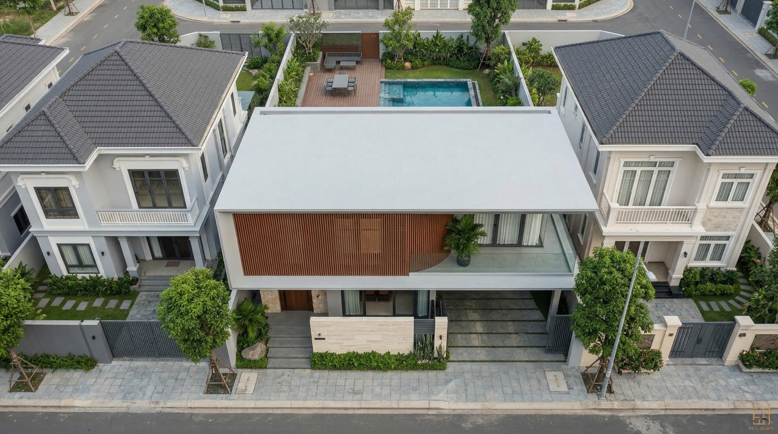Tại BLOCK 8, ngôn ngữ thiết kế được định hình bởi những đường nét tối giản, dứt khoát. Điểm nhấn nằm ở hệ lam gỗ chạy dọc bao phủ diện mạo tầng hai, tạo nên một lớp màng lọc ánh sáng đầy tinh tế. Sự tương phản giữa bề mặt đá travertine thô mộc ở khối đế và hệ trần gỗ ấm áp phía trên tạo nên một nhịp điệu vật liệu ổn định, sang trọng nhưng không phô trương.